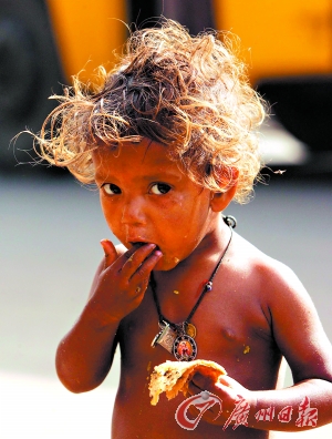 印度新德里的一名小男孩在街上吃东西。(资料图片)