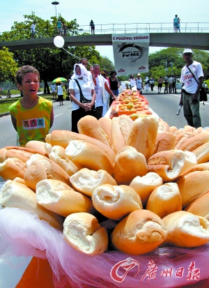 在巴西里约热内卢的世界粮食日上,食桌旁准备了免费领取的面包。(资料图片)