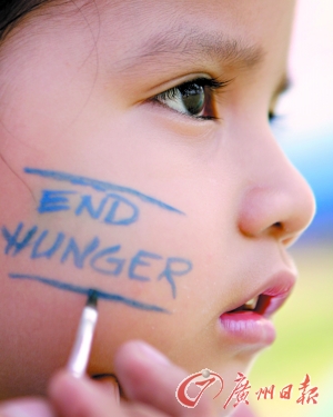 在马尼拉,一名小女孩脸上写着“结束饥饿。”(资料图片)