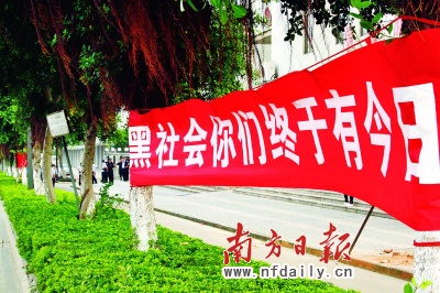 阳江市中级法院大门两侧,“公检法,为阳江人民打黑除恶劳苦功高”、“恶有恶报,伸张正义”、“今天是阳江南霸天的末日”、“阳江黑社会,你也有今天”、“全市人民拥护人民法院正义判决”等横幅在风中飘动。据中院门卫讲,这些都是群众连夜挂上去的。