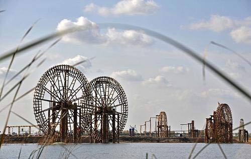 世界水车博览园内已经安装完毕的各类水车(10月26日摄)。