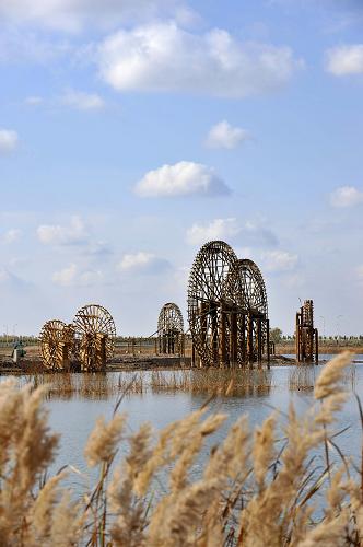 近日,位于宁夏灵武市黄河金岸的世界水车博览园水车安装工作进入尾声。该水车博览园分为水车展示园、水车博物院、休闲活动区等,规划占地面积2100亩,总投资5000万元,建成后将汇集古今中外各类水车,展现水车在农业发展进程中的演化历史。新华社记者 王鹏 摄