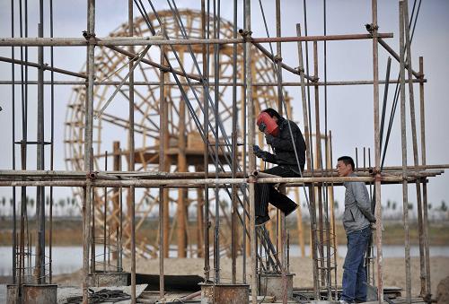 工人在宁夏灵武世界水车博览园内施工(10月26日摄)。