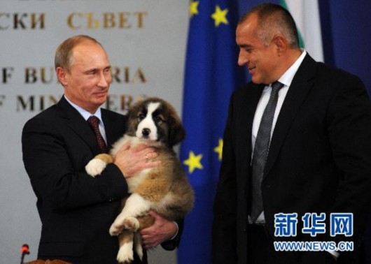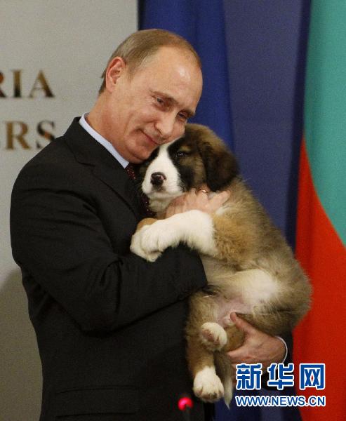 11月13日,在保加利亚首都索菲亚,俄罗斯总理普京将保加利亚总理鲍里索夫赠送的保加利亚牧羊犬抱在怀中。当天,保加利亚能源控股集团与俄罗斯天然气工业公司签署了关于成立合资公司,共同建设、管理“南溪”线天然气管道保加利亚段项目的协议。普京和鲍里索夫出席了签字仪式。新华社/路透