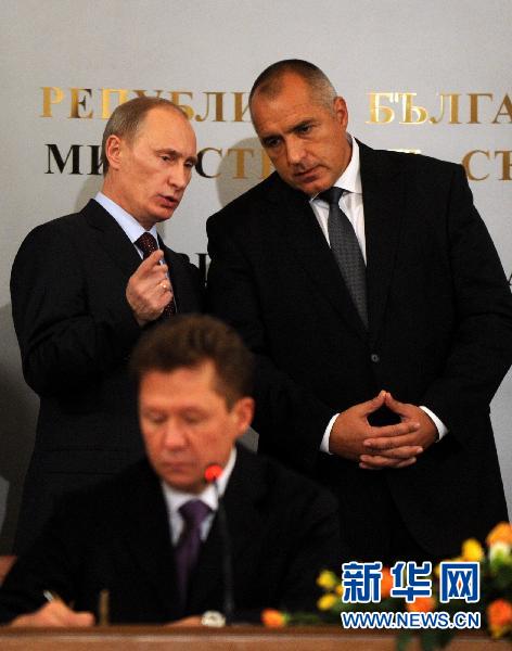 11月13日,在保加利亚首都索菲亚,俄罗斯总理普京(后左)和保加利亚总理鲍里索夫(后右)出席共建天然气管道协议的签字仪式。当天,保加利亚能源控股集团与俄罗斯天然气工业公司签署了关于成立合资公司,共同建设、管理“南溪”线天然气管道保加利亚段项目的协议。新华社/法新