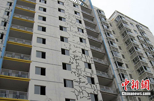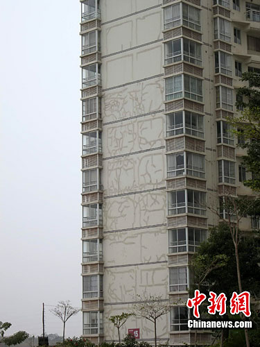 广西南宁市青环路一个新建楼盘的几处外墙,出现大片裂痕,经施工人员修补后犹如“外星文”。业内人士称,这种裂缝主要是因为目前建筑使用的泡沫混凝土材料容易膨胀变形所致,同时也跟施工现场的含水率、砂浆、涂料等有关。而开发商表示,该现象在广西其他楼盘较为多见,但不会影响到楼房主体的验收和质量的安全。