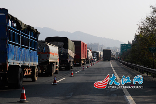 记者看到,事故现场车辆绵延约1公里,仍有多辆货车和3辆客车滞留,涉事小车已拖离现场。