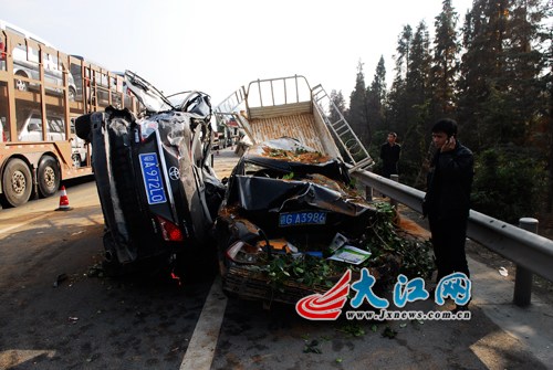 11月27日上午8点左右,昌九高速K649公桩处(德安路段附近)发生5起车辆追尾事故。图为车辆滞留在事故现场。