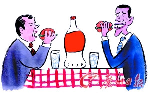 美国总统奥巴马和俄罗斯总统梅德韦杰夫今年6月曾在一起吃汉堡。俄罗斯承诺与美国为首的北约不再为敌。卡格尔漫画