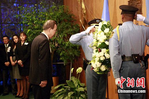 当地时间1月12日,联合国纽约总部举行特别活动,纪念海地大地震一周年,并沉痛悼念不幸罹难的联合国工作人员和海地民众。图为联合国秘书长潘基文在当天下午4点53分,即一年前海地发生地震的时间,为死难者敬献花圈。中新社记者 孙宇挺 摄
