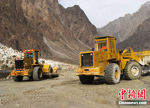 图为喀什公路职工正在用大型机械抢修中断的中巴公路。