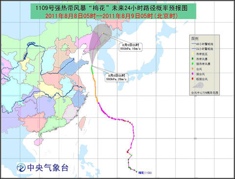 预计,“梅花”将以每小时25-30公里的速度向偏北方向移动,强度缓慢减弱,并逐渐向辽宁庄河到朝鲜西部一带沿海靠近,并将于8日傍晚前后在这一带沿海登陆。