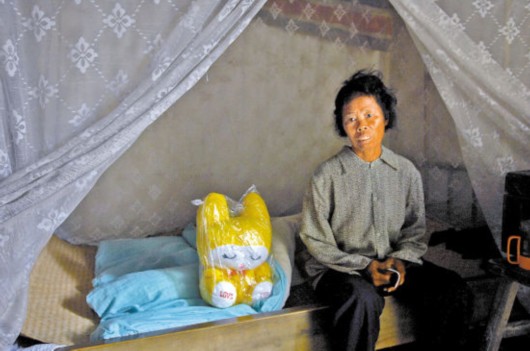 彭记明的床上孤独地放着她一直不舍得打开透明保护胶的布娃娃
