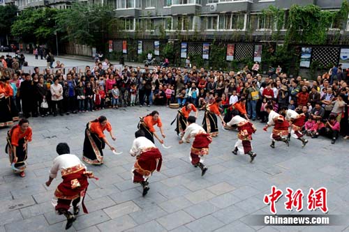 当天,道孚县还在宽窄巷子举行了原汁原味的特色民族歌舞表演,其中来自“最后的走婚部落”——扎坝大峡谷的原生态歌舞《嘛呢经舞》是首次在成都上演。精彩的歌舞表演赢得了当地市民和游客的阵阵掌声。