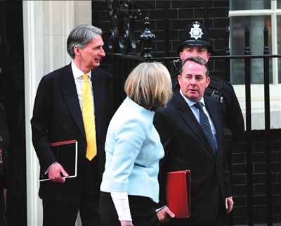 这张2010年5月13日拍摄的资料照片显示,时任运输大臣哈蒙德(左)和国防大臣福克斯(右)在内阁会议后离开英国首相府唐宁街10号。新华社发
