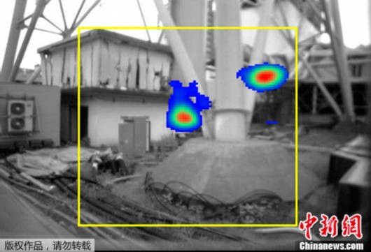 图为7月31日东京电力公司提供的使用伽马射线相机拍摄到的福岛一号核电站1号和2号机组反应堆所在建筑附近主排气筒下方管线表面辐射严重的景象。