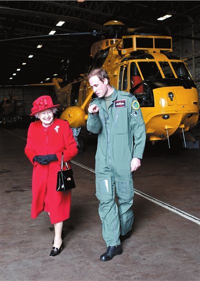 4月1日,英国女王伊丽莎白在威廉王子陪同下,参观了位于威尔士西北地区的河谷空军基地,威廉王子在此基地担任救生直升机驾驶员。图/人民图片