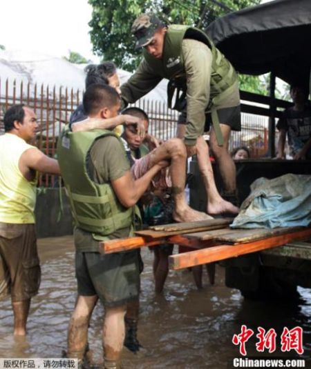 菲律宾南部连日来遭到热带风暴“天鹰”引发的大雨和洪水重创,受灾人口超过10万人。菲律宾红十字会18日上午透露,死亡人数已经升至447人。灾情最惨烈的卡加延德奥罗市和伊利甘市17日相继宣布进入“灾难状态”。图为士兵帮助一名伤者登上卡车。