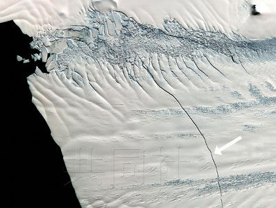 美国地球观测卫星“Terra”上搭载的光学感应器2011年11月拍摄到南极派恩岛冰川出现30公里长的裂缝(箭头所指处),一座巨型冰山正在形成。照片由美国宇航局提供。