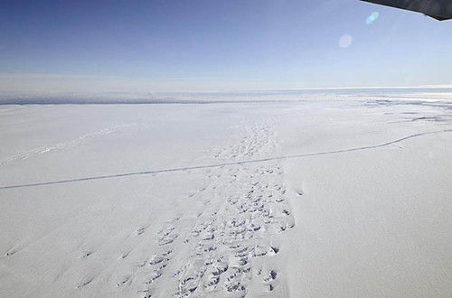 照片摄于去年11月。位于南极西部的派恩岛冰川出现了一条宽约80米,深约60米的长达30公里的裂缝。据估计,不久之后一座面积约900平方公里的巨型冰山将会形成,并脱离冰川。