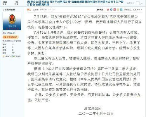 随着事件在网络上的传播,当地警方很快做出反应。7月14日下午,洛阳市公安局官方微博“平安洛阳”进行权威发布,称已做出行政拘留打人者10天的处罚决定。 洛阳市公安局洛龙派出所称:7月13日,网友“天理何在2012 ”在信息港发题为“洛阳高新国税局朱局长率领黑社会打手入户殴打抢劫”一贴后,我所迅速组织人员进行了调查核实。