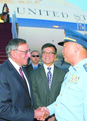 昨晚,帕内塔(左)抵达北京,中国人民解放军副总参谋长马晓天(右)前往迎接。美国驻华大使骆家辉(中)也在场。