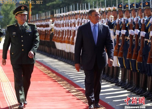 9月18日上午,中国国务委员兼国防部长梁光烈上将,在北京八一大楼为美国国防部长帕内塔访华举行欢迎仪式。中新社发 宋吉河 摄