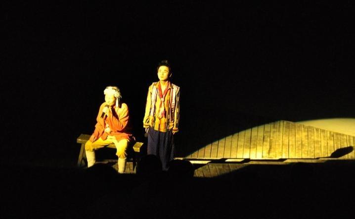 在三声钟响后,一片寂静中,江水奔腾声与川江号子声悄然交替而起。一束强光打破夜的黑暗,舞台中央“祖孙俩”将川江号子了千年历史娓娓道来。