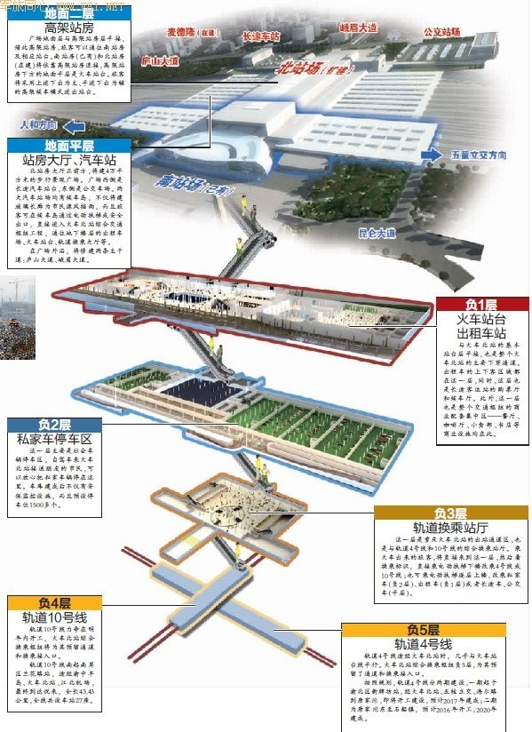北站房及其综合交通枢纽工程,地面上有两层,地下共有5层。建成后,重庆火车北站将成为以铁路客运为中心,集长途汽车、公交客运、出租车辆、社会车辆和轨道交通于一体的综合交通枢纽(如右图示)。