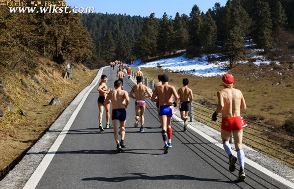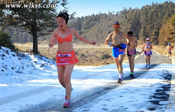此次“光猪跑”比赛分为5公里和10公里,赛道为仙女山大草原环线公路。参加比赛的有帅哥、也有美女,其中年龄最大62岁,最小的仅10岁。比赛前,参赛选手们纷纷脱下冬衣开始热身运动,美女们大都穿上了性感的泳衣,不少帅哥却装扮“雷人”。雷锋帽,花肚兜,大花裤衩,东北爷们驾到;一位带上一顶长长的竹“皇冠”;一位穿上可爱的无尾熊睡衣,现场卖起了萌……,在冰冷空气的刺激下,“光猪”族们却伴随音乐的节拍,跳起舞,并越玩越high。